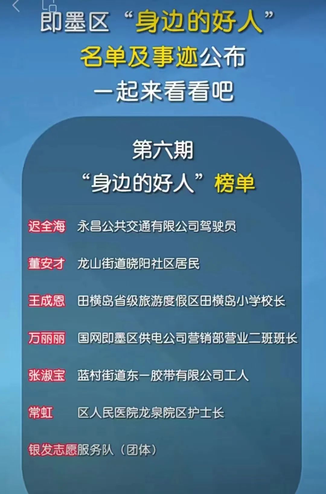 其次是駕駛員遲全海因兩次救人及拾金不昧等好人好事被評為即墨區(qū)第六期“身邊的好人”。